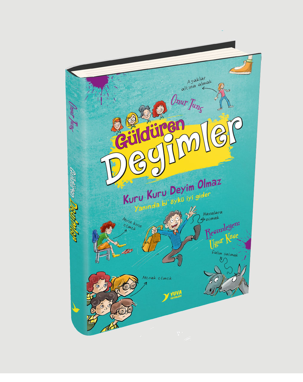 Geçenlerde “yer yarılıp da içine girmek” diye bir şey duydum. Düşündüm, düşündüm; sahiden de yer durduk yere yarılır mıydı? Bir de “başına çorap örmek” dediler; iyi de benim bildiğim başa şapka takılır, çorabın başta işi ne? Ha tabii “taşı sıksa suyunu çıkarmak” lafına da gülmeden edemeyeceğim. Geçen gün denedim, denedim; ı ıh, yok, bir damla bile çıkaramadım. Sonradan öğrendim ki bu sözlerin anlamları hiç de sandığım gibi değilmiş. Aslında bunlar çookk başka anlamlara geliyormuş. Sen de merak ettin, değil mi? Bu kitapta her deyim için bir hikâye var. Oku bak, sen de hemencecik anlayacaksın kazın ayağının hiç de öyle olmadığını.